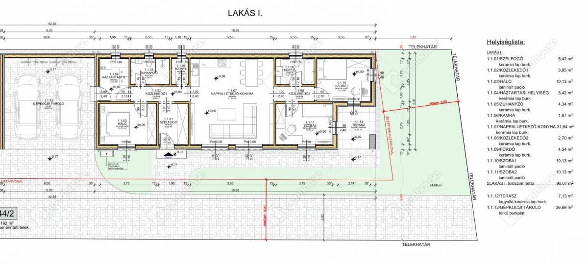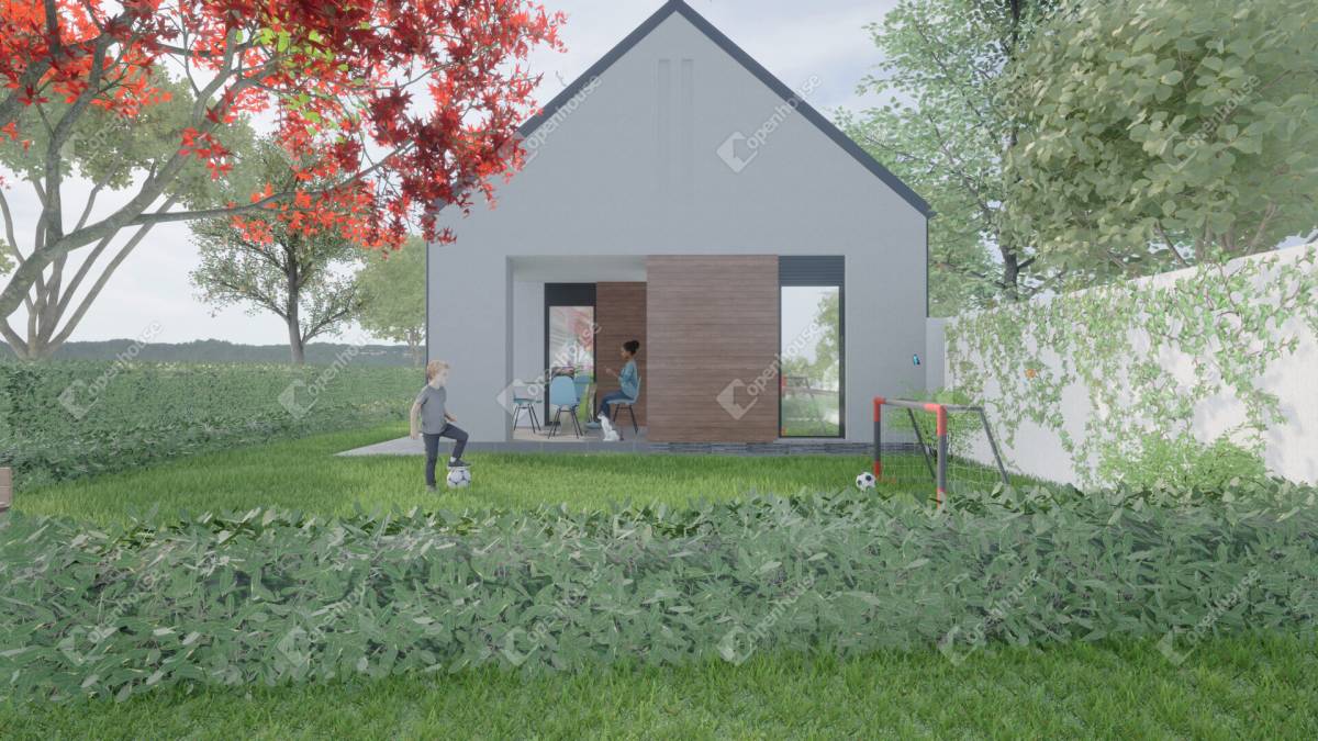 Az itt bemutatásra kerülő ingatlan földszintes, praktikus kialakítással. Az épületben található szélfogó, 2 közlekedő, nappali-étkező-konyha egyben, 3 hálószoba, 1 zuhanyzó a szülői háló közelében, és 1 fürdő a gyerekszobák mellett, illetve található még háztartási helyiség, és kamra. Az épülethez tartozik saját terasz, illetve saját 2 beállásos fedett kocsibeálló.