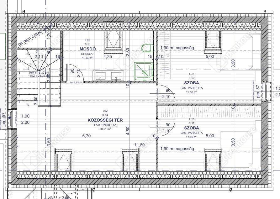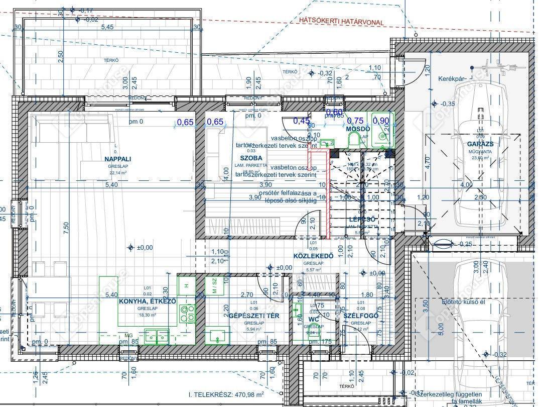 - 185,81 m2- es (fsz.: 84,1 m2 + garázs 23,60 m2; össz.: 107,7 m2; em.: 78,11 m2),
