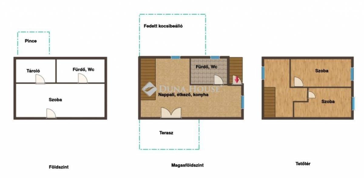 A ház nagyon jó elosztású: az emeleten viszonylag tágas tér gardróbnak és dolgozósaroknak; gyermekszoba, háló; a középső szinten amerikai konyhás nappali terasszal és örök panorámával; a földszinten külön lakrész könnyen kialakítható (szülőknek, vendégeknek vagy hobbiszintnek), a fürdő előkészítve.