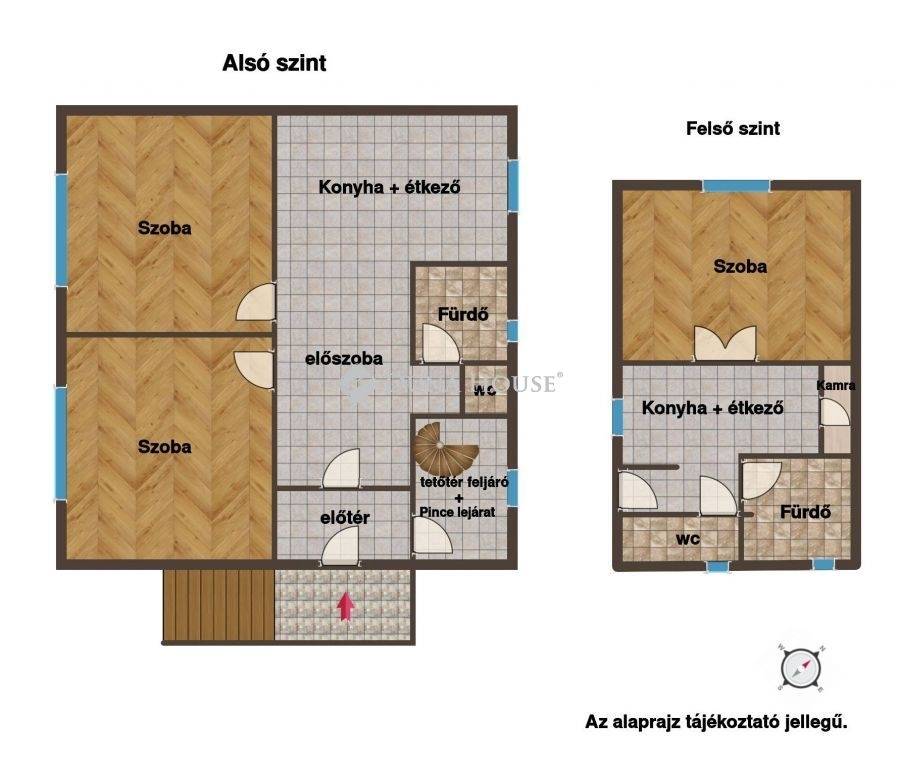 A földszinti alapterület 75 m², a tetőtér pedig 36 m² ami teljesen eredeti állapotban így kiváló lehetőség a saját igény szerinti kialakításra.