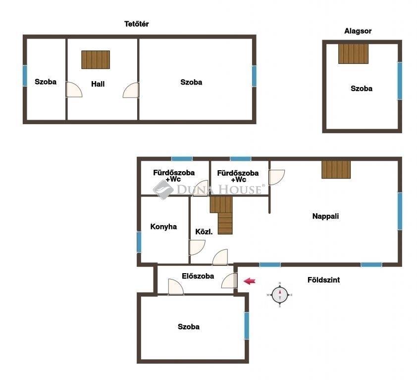Az ingatlan több szintes kilakítású. Fő szintjén egy hatalmas nappaliszoba, egy ablakos konyha, egy további hálószoba, két füdőszoba+wc, és egy előszoba helyiségek találhatóak. Mivel a ház domboldalban épült, így a nappali alatti részen szuterén került kilakításra, ahol még egy további, tágas szoba kapott helyet, nagy méretű ablakkal, kellemes fényviszonnyal. A ház tetőtere szintén beépítésre került, itt egy hallból két külön bejáratú hálószoba nyílik.