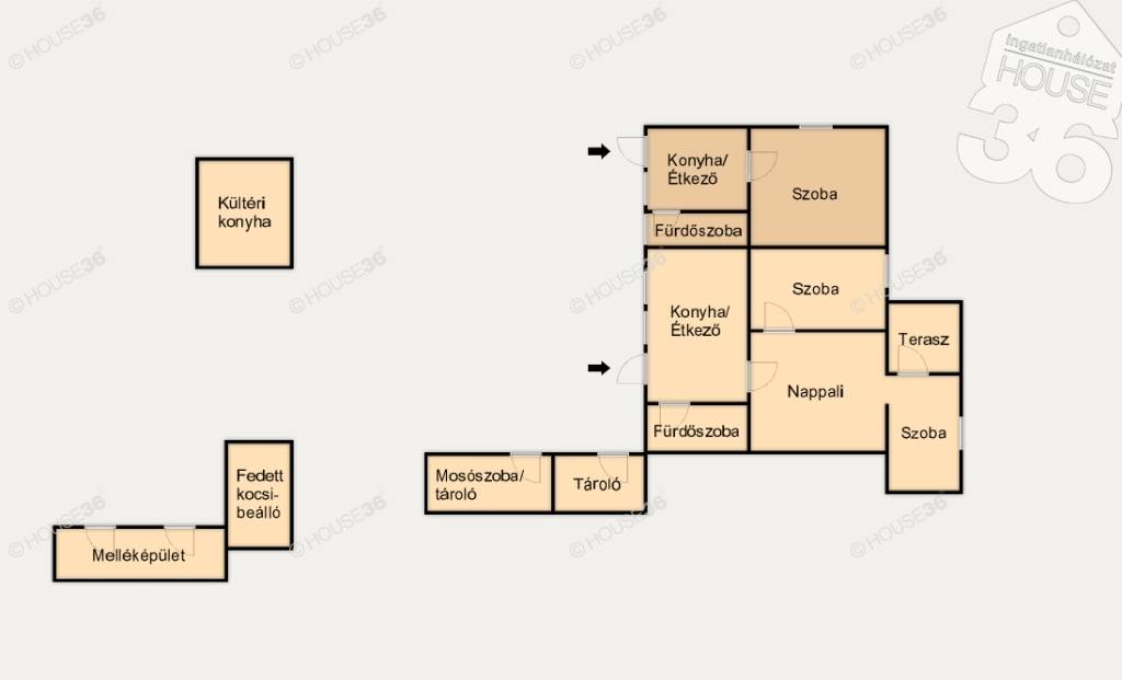 Az ingatlanhoz vásárolható további 23 m2 lakóterület (konyha-szoba-fürdőszoba) és további 1426 m2 telekterület, aminek az ára további 10 Millió forint.