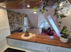 A nappaliban különleges kialakítású ablakok, reggeli kávéját napsütésben, a hangulatos nappali-konyhában élvezheti.