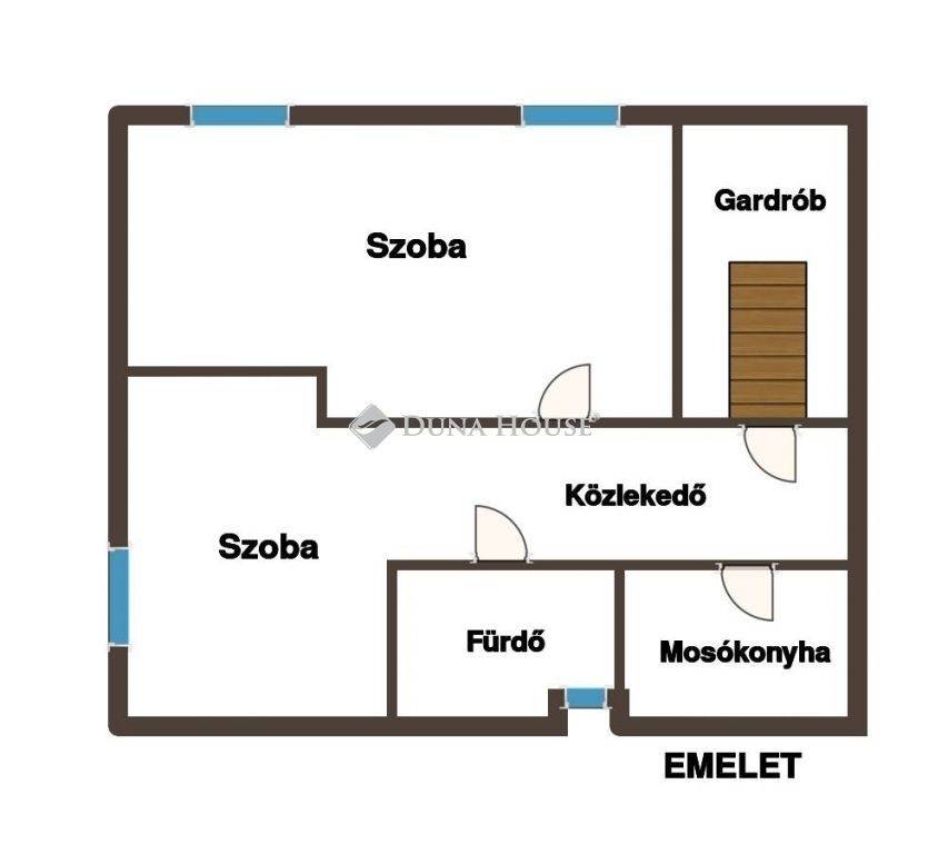 Az emeleten a 2 szoba mellett egy nagy gardróbot, fürdőt, mosókonyhát és közlekedőt találunk.