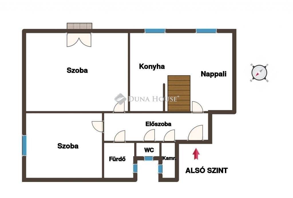 A lakás praktikus elrendezésű, kényelmes egy nagyobb család számára is. Alsó szintjén amerikai konyhás nappali, 2 tágas szoba, előszoba, fürdő, WC és kamra kapott helyet.
