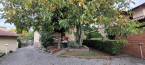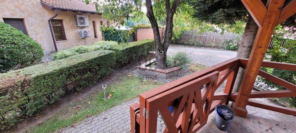 Kert jól gondozott, virágos, nagy fák(fenyő, dió), sövények, kis füves terület, térkő burkolat, kerítéssel elválasztott első- és hátsó kert, kukatároló helyiség, fúrt kút is található.