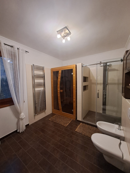 a tágas nappali-étkező egy légtérben, modern, gépesített konyha, vendégwc, szülői hálószoba, melyhez tartozik egy saját gardrób és egy nagyméretű fürdőszoba, melyben a kabin mellett egy kétszemélyes infraszauna ( Wellis) is helyett kapott.