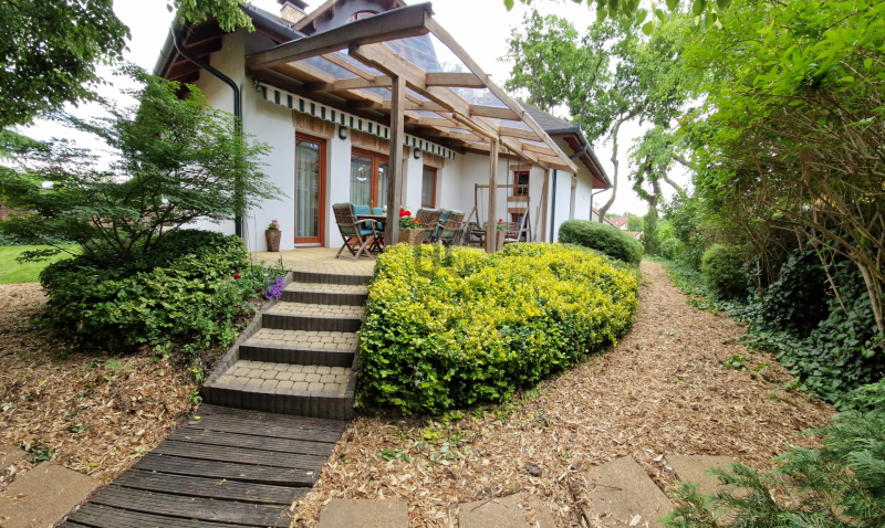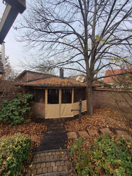 A kertben automata öntözőrendszer került kiépítésre, melynek működtetése a fúrt kútról megoldott. A kertben egy fedett kemencés kerti főzőhely is kialakításra került. A 30 nm-es, motoros árnyékolóval ellátott fedett terasz lehetőséget biztosít a pihenésre, családi összejövetelekre. A terasz mellett egy nagyméretű, árnyékot adó hársfa található.