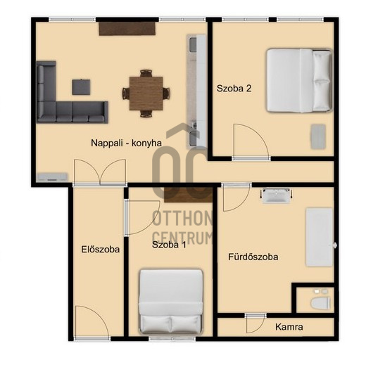 • 2 nagy szoba, amerikai konyhás nappali, kamra