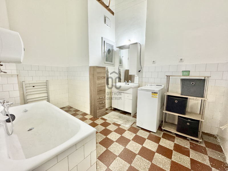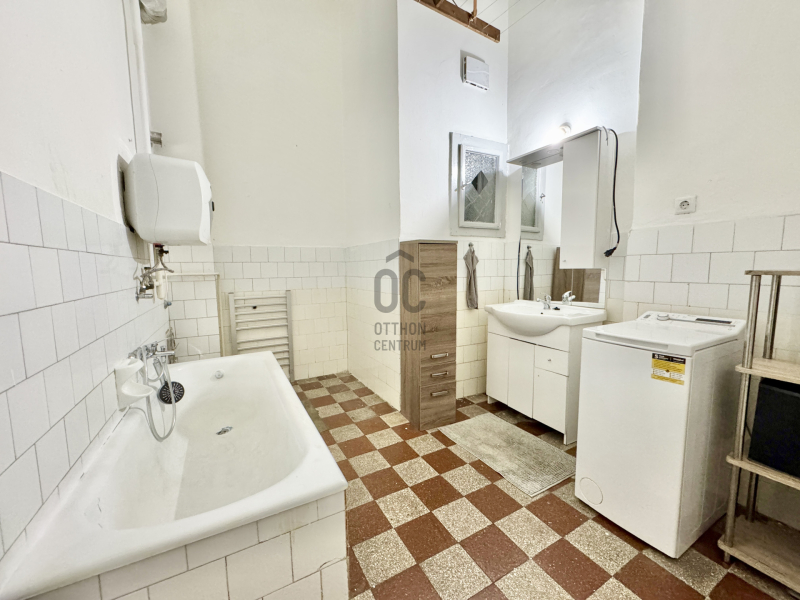 - nagy méretű fürdőben: kád, vízmelegítő bojler, felültöltős mosógép, ablak