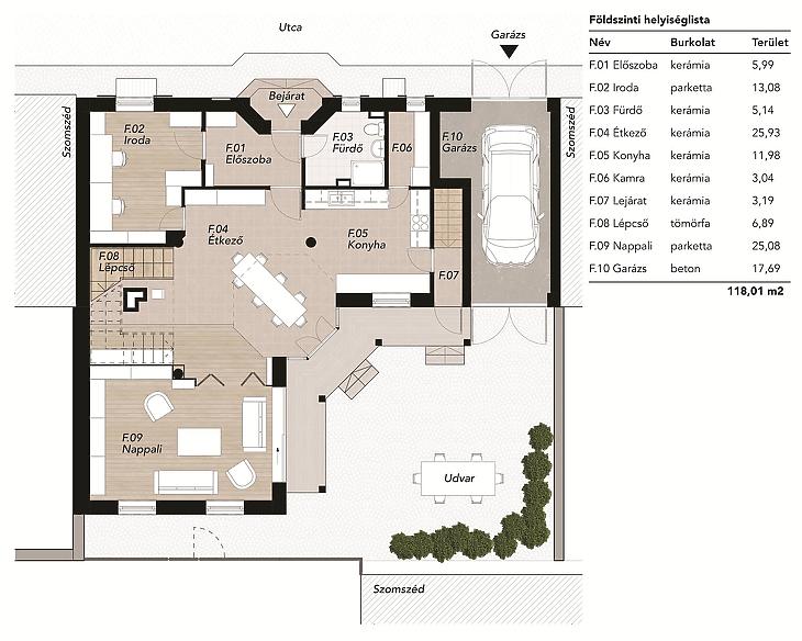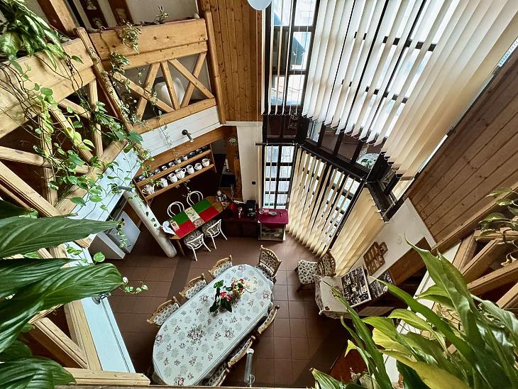 Az alsó szinten, amerikai konyhás nappali, fürdőszoba, előszoba és egy hálószoba van, míg a felső szinten, két hálószoba, közlekedő, 2 db fürdőszoba külön 2 db WC található, így összesen 3 hálószoba, 3 fürdőszoba, és 3 WC van. A nappaliból és az étkezőből közvetlen kapcsolta nyílik a 25 nm-es fedett teraszra.
