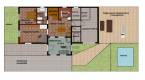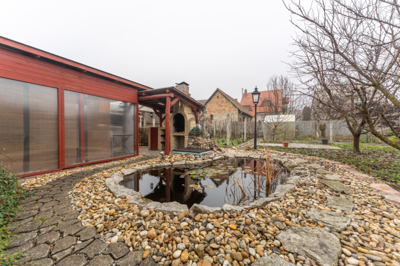 • fóliasátor, medencének kialakított terület és kis kerti tó