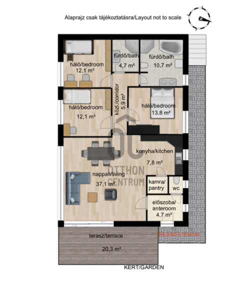 Budapest, Buda, II. kerület, 2. kerület, Máriaremete, eladó lakás, újszerű, 4 szoba, 2 fürdő, terasz, saját kert, 2 kocsibeálló