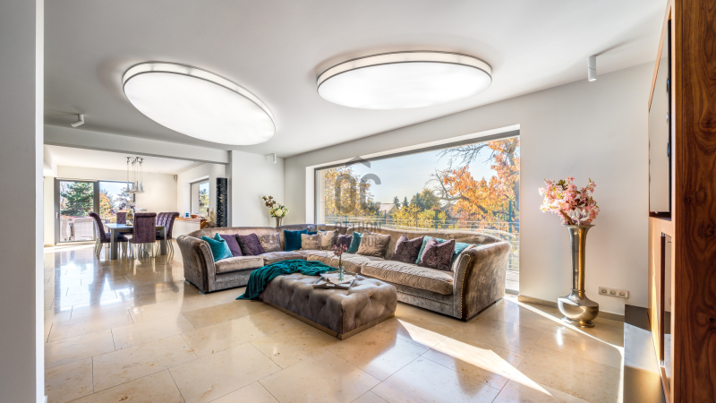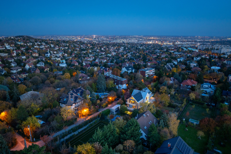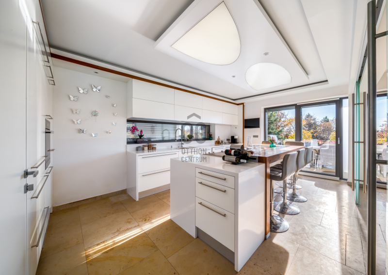 A XII. kerület erdőszegélyén, dombtetőn áll ez a 775 m²-es, négyszintes, déli tájolású családi villa egy ~2200 m²-es telken.