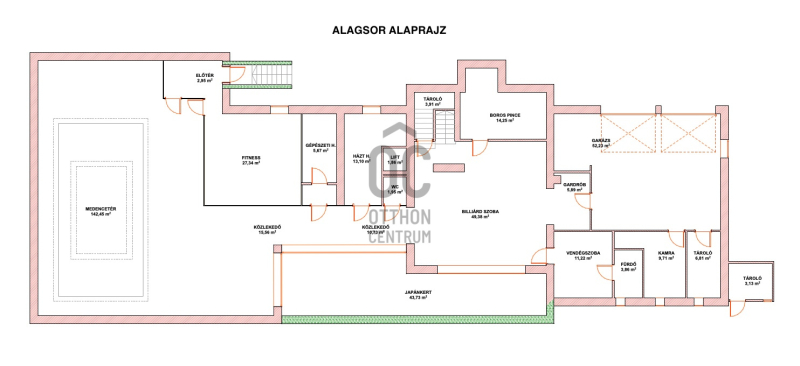 A nagy üvegfelületeknek köszönhetően az alsó szint is fényben gazdag; itt található a borospince, a családi játéktér, és az üvegfelületek mögött egy kis japán kert, amely tovább fokozza a nyugalom és harmónia érzetét.