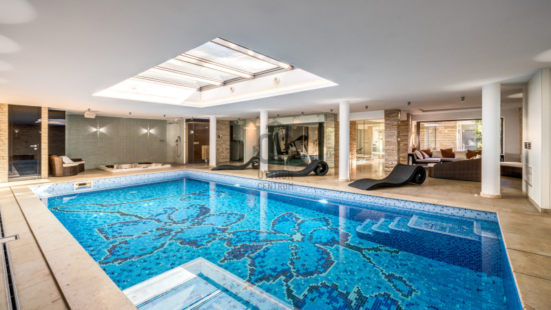 11 szoba, 5 fürdő, 3 külön mosdó, tágas közösségi zónák, privát wellness és fitneszterem; a kertben saját teniszpálya és kosárlabdapálya, reflektorvilágítással.