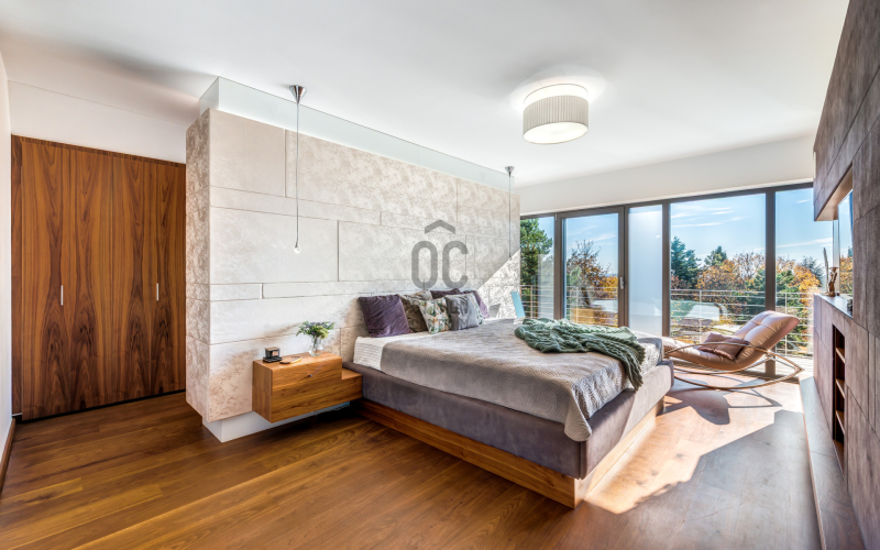 A szülői lakrész külön univerzum: kétoldali gardrób, privát terasz és szobaméretű, panorámás fürdő, ahol kő, fény és víz időtlen egységet alkot.
