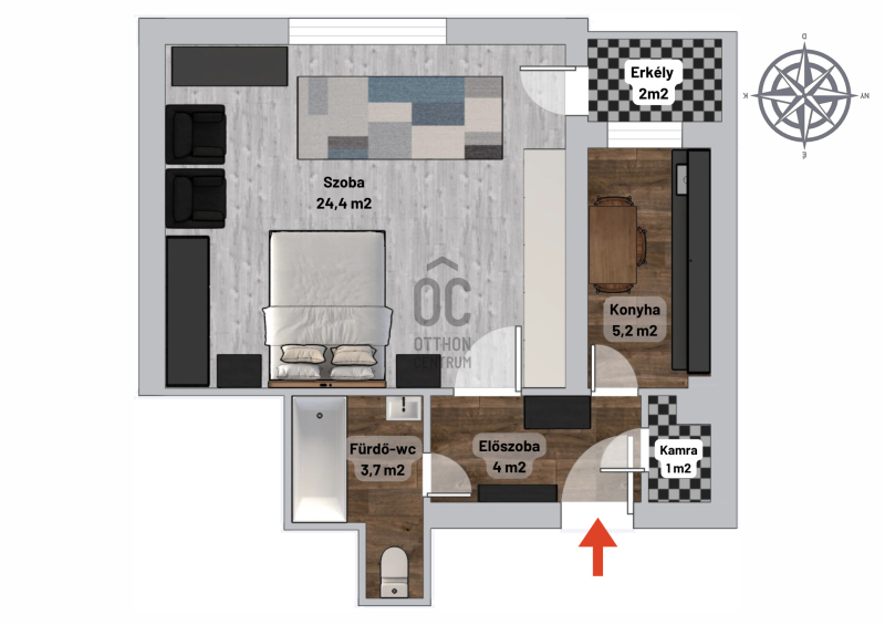 ✅ Felosztása: előszoba, lakószoba erkély kapcsolattal, konyha, kamra, fürdőszoba - WC.