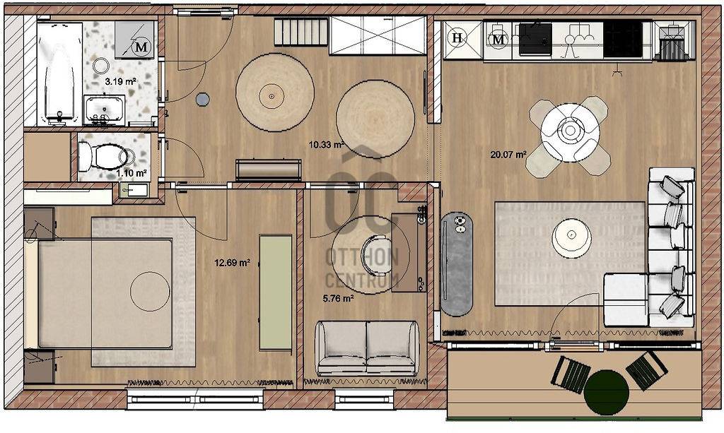 Elosztás: nappali + 2 hálószoba