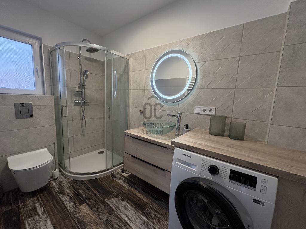 A fürdőszoba ízléses, mosógéppel felszerelt.