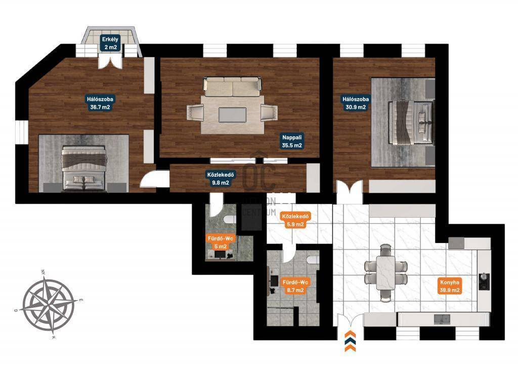 Felosztása: nappali, konyha-étkező, 2 hálószoba amelyből az egyik erkélykapcsolattal rendelkezik, két fürdőszoba WC-vel.
