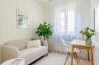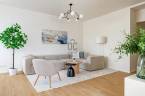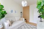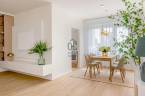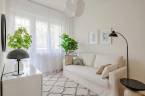 A nappali a lakás központi éke: tágas, rendkívül világos, zöldre néző ablakokkal és stílusos, egyedi készítésű médiafallal.