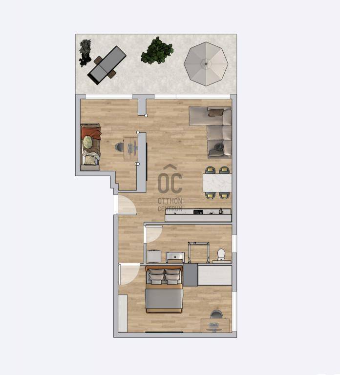 Elosztás: amerikai konyhás nappali, kettő hálószoba, 16m2 terasz, előszoba, fürdőszoba.