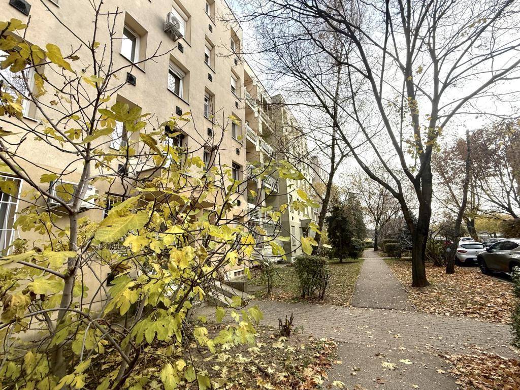Az épület mögött tágas, zöld terület található, ahová a lakás ablakai is néznek.