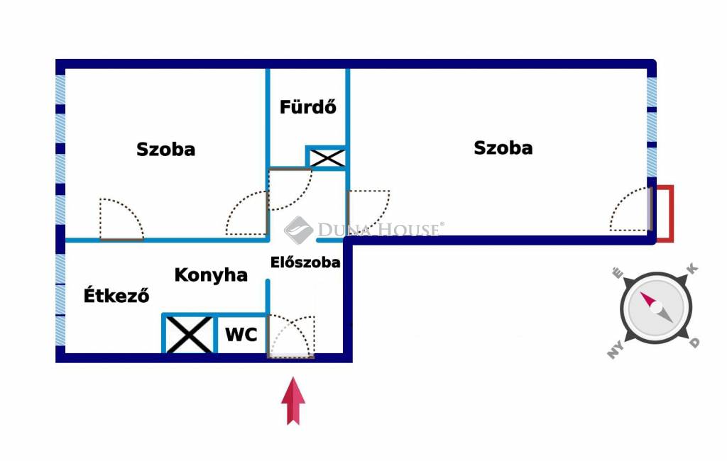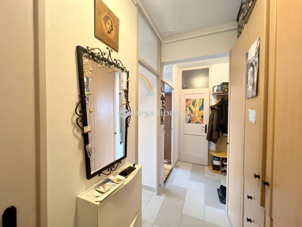 Az ingatlanba a bejutás egy több ponton záródó biztonsági ajtón keresztül történik, az elosztása kiváló, áll két szobából, egy előszobából, étkezős konyhából, külön fürdőből és WC-ből, a nagyobbik szobából franciaerkély nyílik. A fűtésről és a meleg víz ellátásról házközponti kazán gondoskodik, a radiátorok már új, alumínium radiátorok. A konyhában elektromos elszívó, a fürdőben gravitációs szellőző áll rendelkezésre. A konyhában étkezőpultot alakítottak ki. A házban nincs lift.