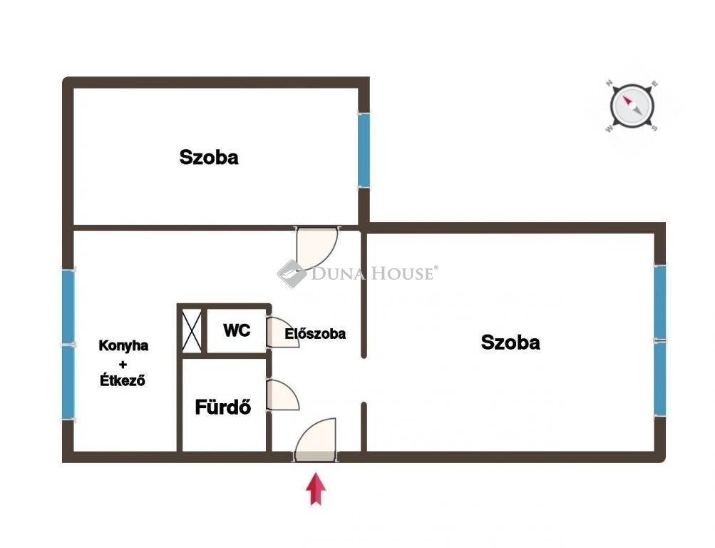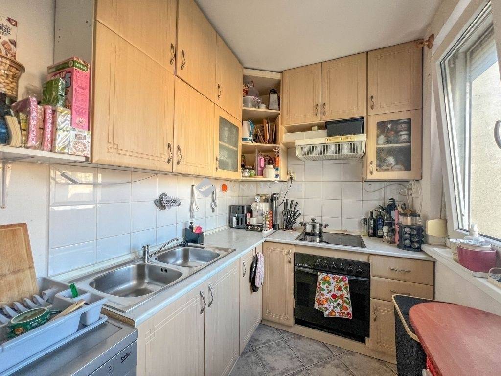 Az ingatlanba egy több ponton záródó biztonsági ajtón keresztül juthatunk be, az elosztása pedig kiváló, áll két szobából, nagy előszobából, ahol beépített szekrények kaptak helyet, egy étkezős konyhából, ami házak közti zöld területre néz, külön fürdőből és WC-ből, továbbá az ingatlanhoz tartozik egy saját tároló is.