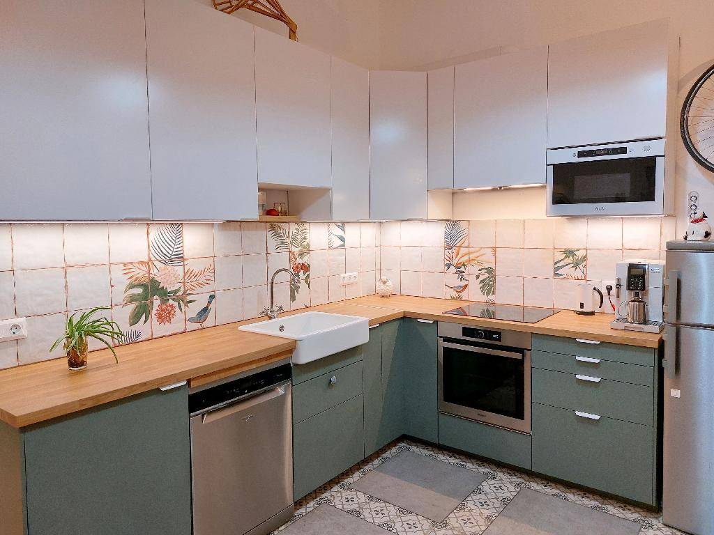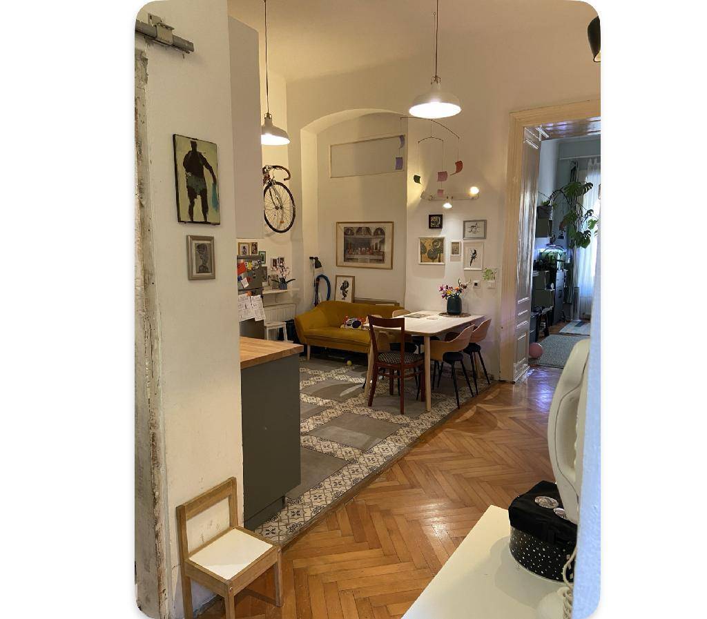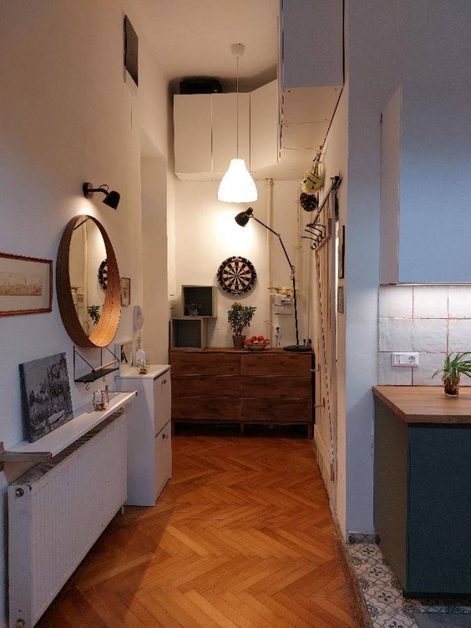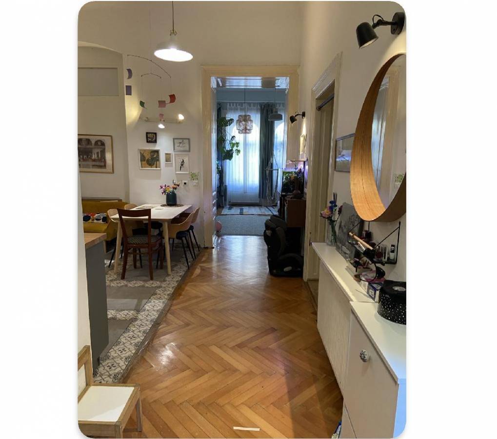 A lakás modern és barátságos hangulatú, ugyanakkor megőrzi a régi polgári otthonok tágas jellegét.