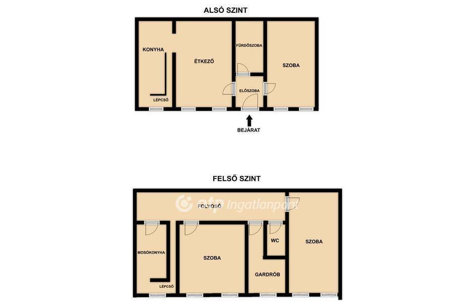 Alsó szint: nappali, étkező, konyha, fürdő, külön szoba.