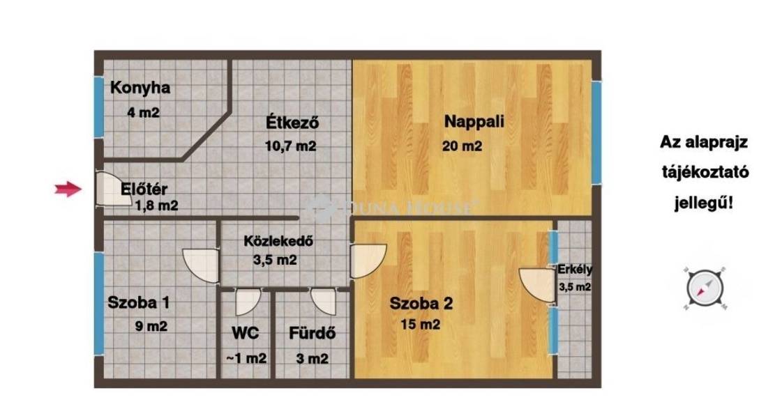 68 négyzetméteren kapott helyet 2 hálószoba, nappali, étkező, konyha, külön fürdőszoba és wc. Az elrendezés a mai kor követelményeinek megfelel, a lakótér és a vendégek fogadására kiválóan alkalmas nappali/étkező elkülönül egymástól.