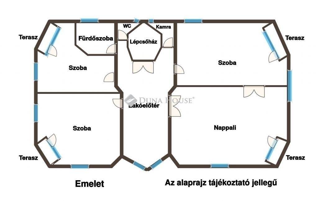 Az emeleti szobák mindegyikéhez különleges ablakmegoldásokkal egy fedett terasz tartozik. Az egész ház körbenapozott.