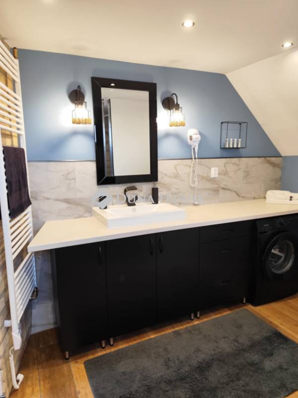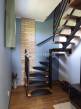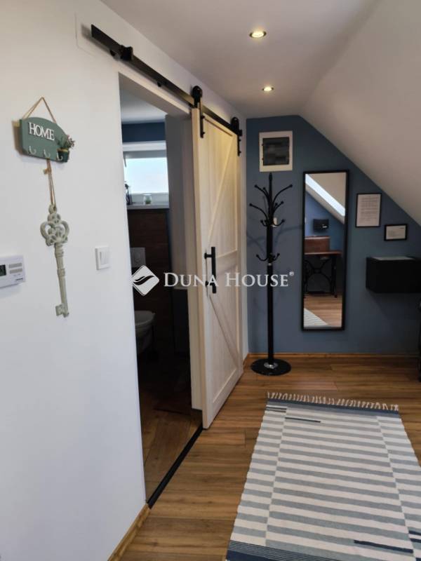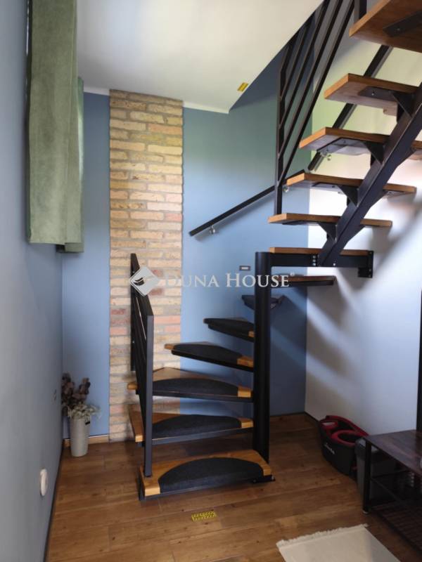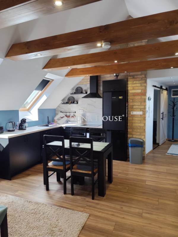 A hátsó fedett teraszon át jutunk fel a zárt lépcsőházon keresztül. A tetőtéri rész egy csodás hangulatú, fa gerendás lakás: amerikai konyhás nappalival, hálószobával, fürdőszobával és gardróbbal.