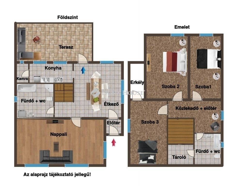Emelet: előtér, 3 külön nyíló szoba (egy erkélyes), fürdőszoba, gardrób