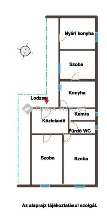 A házban 2+1 szoba, nappali, konyha, fürdőszoba WC-vel, közlekedő, nyári konyha/tároló illetve egy lodzsa található.