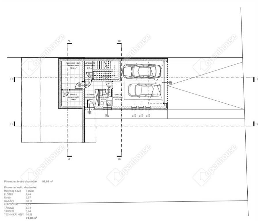 Az alsó, pinceszinten egy 38 m²-es dupla garázs, előtér, fürdő, két tároló, valamint a hőszivattyús fűtési és melegvíz ellátást biztosító technikai helyiség található.