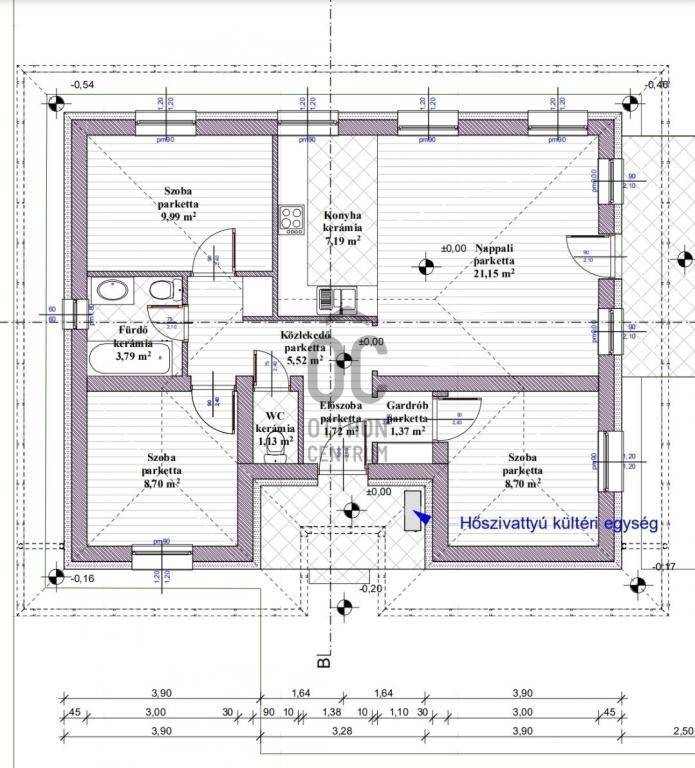 A fűtést hőszivattyús padlófűtés rendszer látja el, amihez H órát is biztosítunk a nulla százalékos fűtéshez.