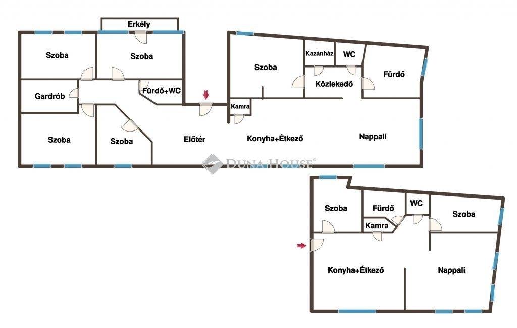 - 152 m2-es lakótér, 5 szoba+nappali, 2 fürdő, 2 WC, konyha+étkező, gardrób, kamra, kazánház