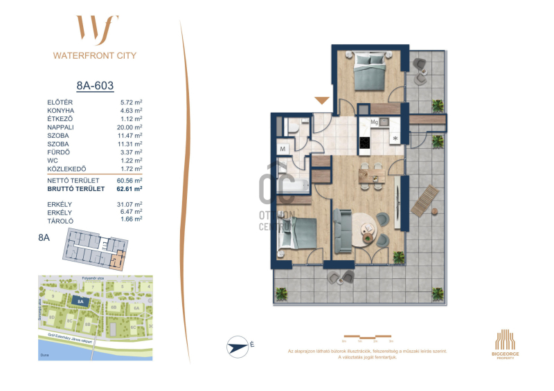 A Waterfront City egy új, modern városnegyed a 3. kerületben, ahol a természet közelsége és a városi kényelem tökéletes egyensúlyban van. A Duna-part közvetlen szomszédságában elhelyezkedő fejlesztés különleges atmoszférát kínál: a sétányt új épületek határolják, üzletekkel, kávézókkal és szolgáltatásokkal, amelyek élhető közösségi teret teremtenek.