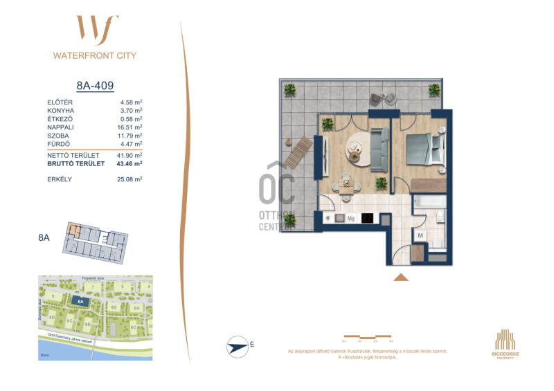 A Waterfront City egy új, modern városnegyed a 3. kerületben, ahol a természet közelsége és a városi kényelem tökéletes egyensúlyban van. A Duna-part közvetlen szomszédságában elhelyezkedő fejlesztés különleges atmoszférát kínál: a sétányt új épületek határolják, üzletekkel, kávézókkal és szolgáltatásokkal, amelyek élhető közösségi teret teremtenek.