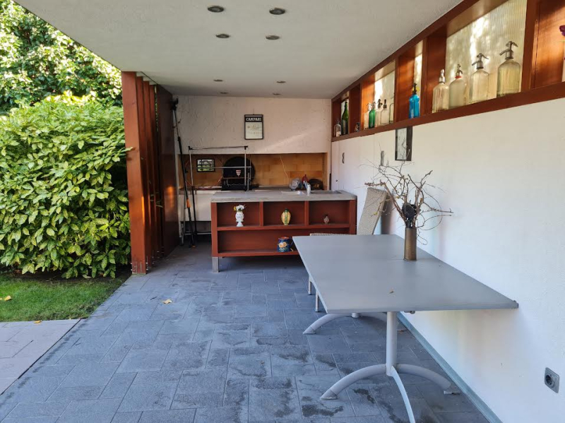 -A hátsó kertben a medence mellett egy nyitott, de fedett nyári konyha grillsütővel, mosogatóval