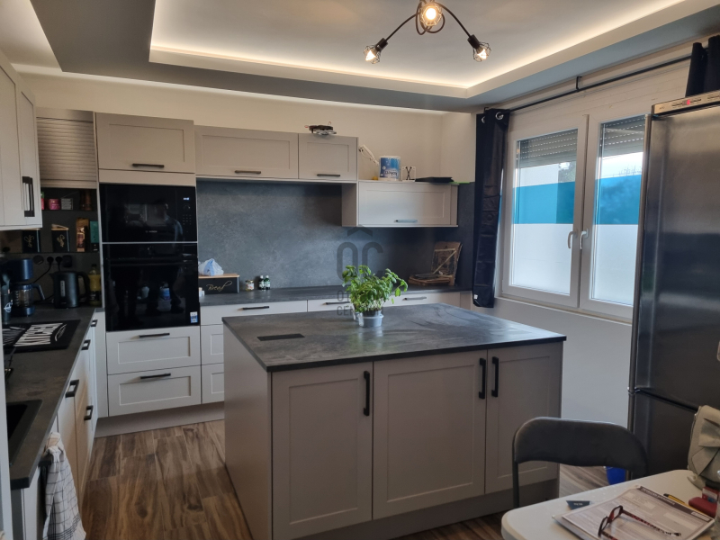 A nappaliból 20 nm-es teraszra tudunk kilépni. Az impozáns beépített konyhabútor az új beépített háztartási gépekkel együtt a házban marad.