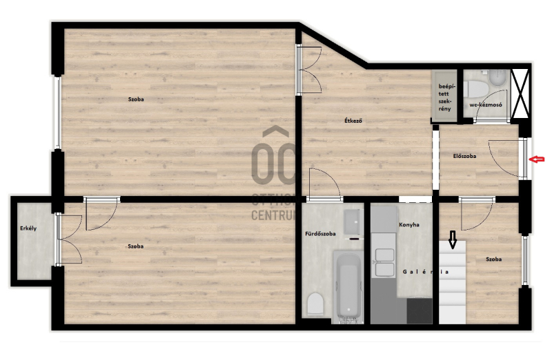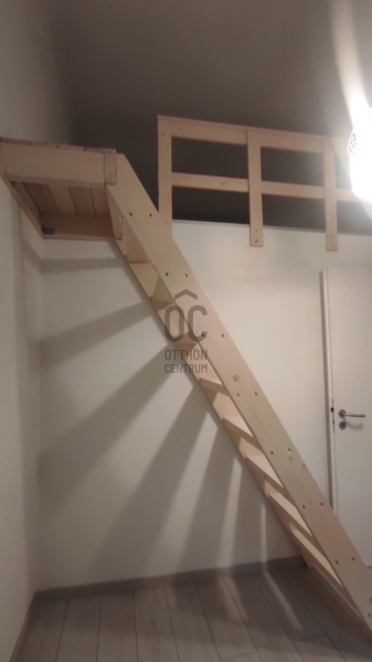 A kisszoba és bejárati rész a függőfolyósó szélesebbik ágára néz. Ez a szoba galériázott. A fekvőgaléria benyúlik a konyha és fürdőszoba fölé, mérete mintegy 3 x 3 m.
