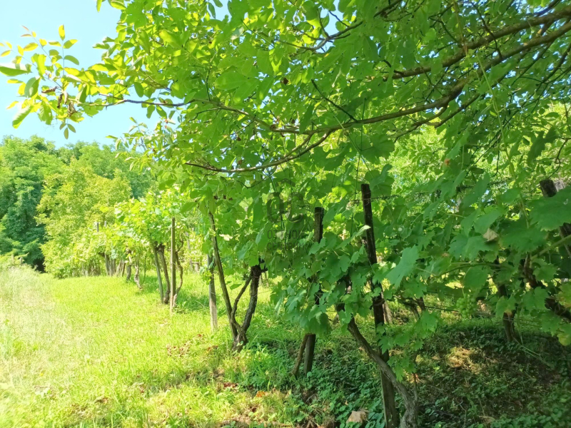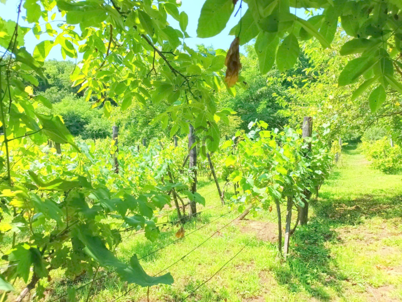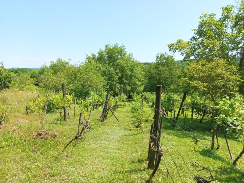 A területen több sor gondozott szőlőt, gyümölcsfákat találunk, a ház előtti rész akácos/fenyőfás liget.