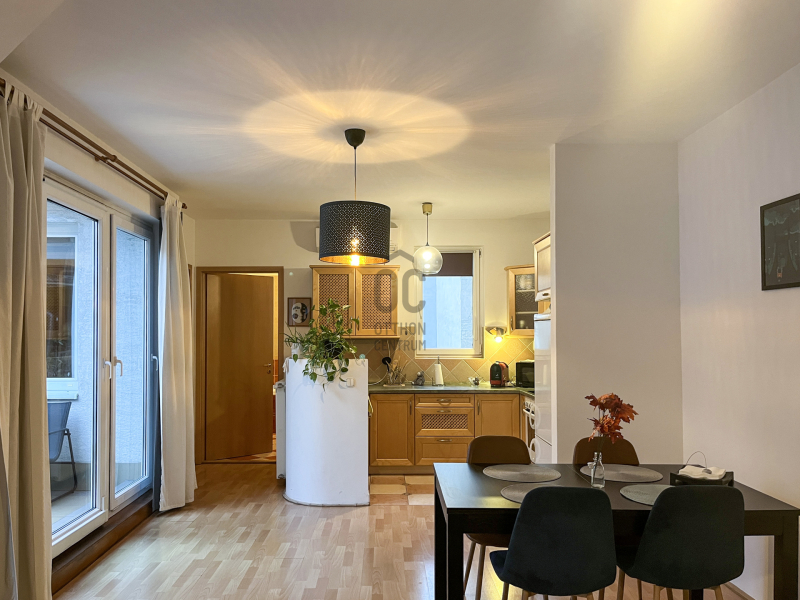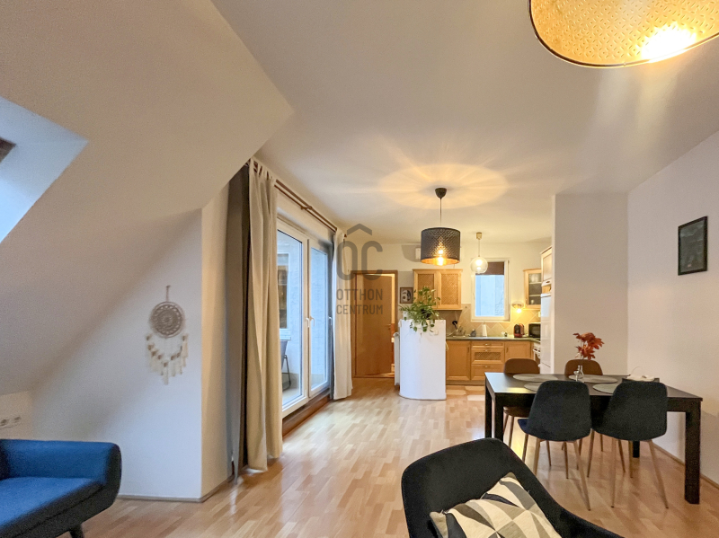 A 3. emeleti, 58 m2-es, 2 szobás lakásban egy amerikai konyhás, rendkívül tágas, étkezős nappali, egy kényelmes, hangulatos, gardróbos hálószoba, egy fürdőkádas fürdőszoba, egy vendég wc-mosókonyha és kényelmes előszoba is található.