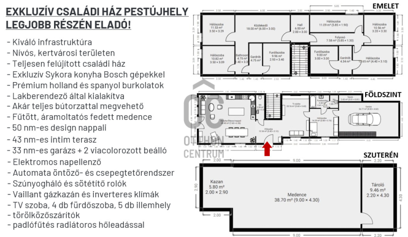 A 3 SZINTEN 3 nappalit, 6 szobát, 4 fürdőszobát és 5 illemhelyet kapott, TÁGAS és VILÁGOS TEREKET, NAGY ABLAKOKAT és rengeteg EXTRÁT.