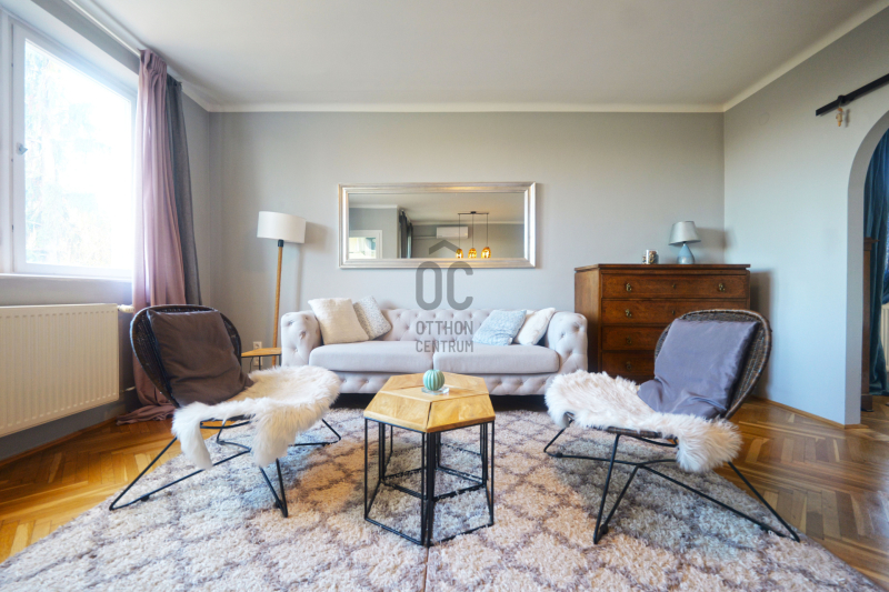 Budapest egyik legelőkelőbb zöldövezeti negyedében, Mártonhegy csendes, ősfás utcájában kínáljuk megvételre ezt a különleges hangulatú, napfényben fürdőző, első emeleti otthont.