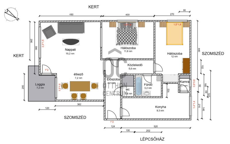 - Szobák: 3 külön bejáratú, jól szeparált helyiség, egyikük hangulatos erkélykapcsolattal (loggia)